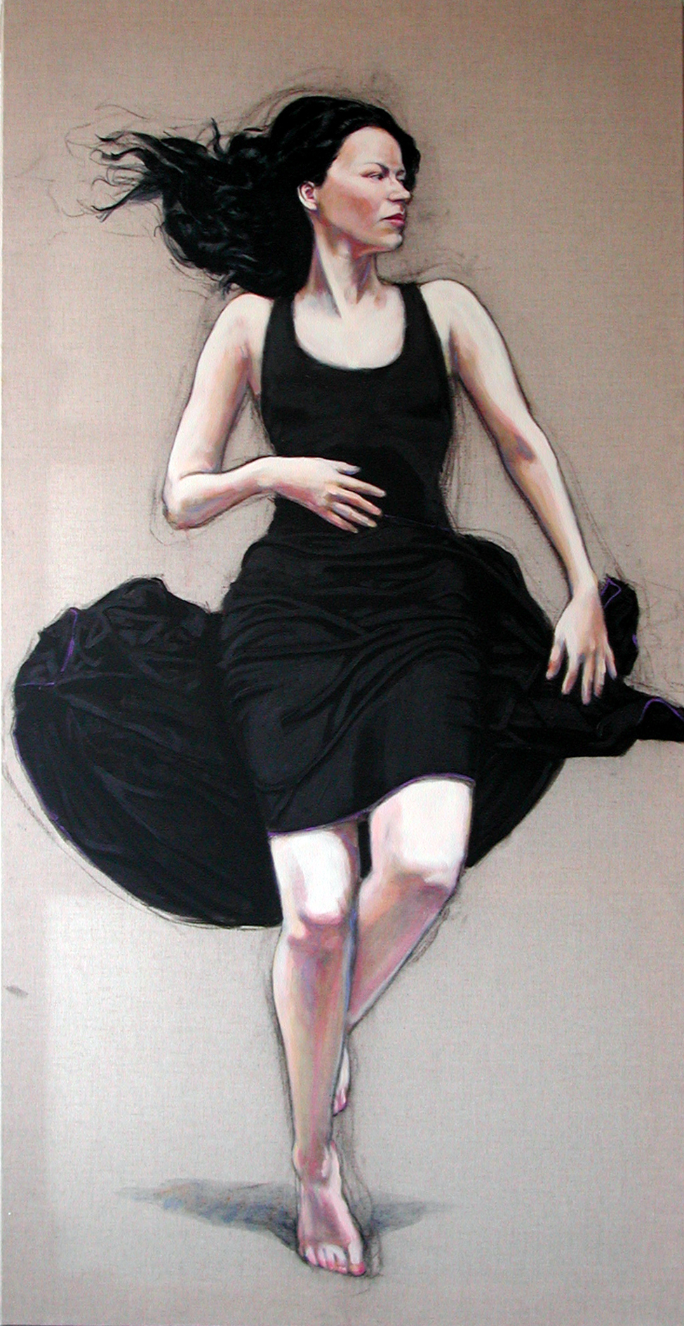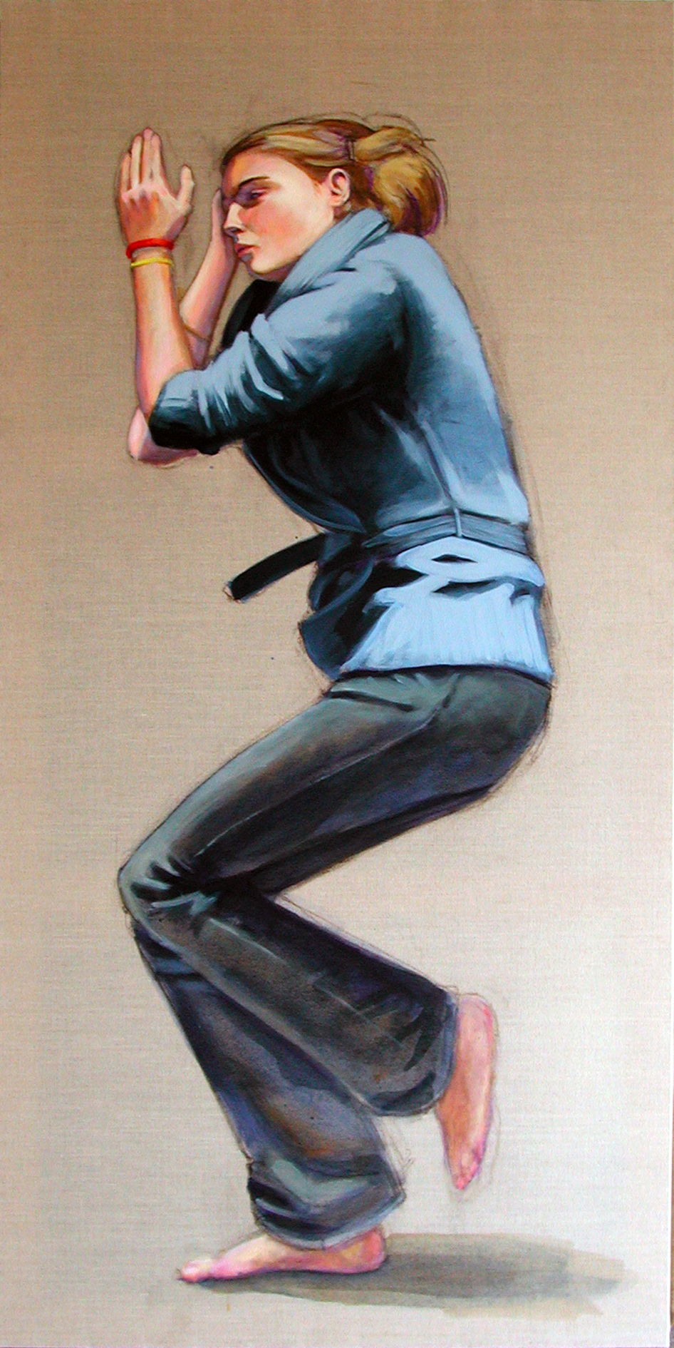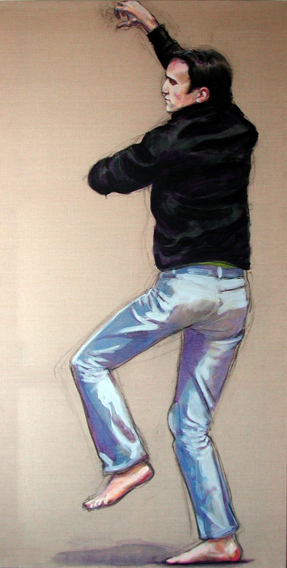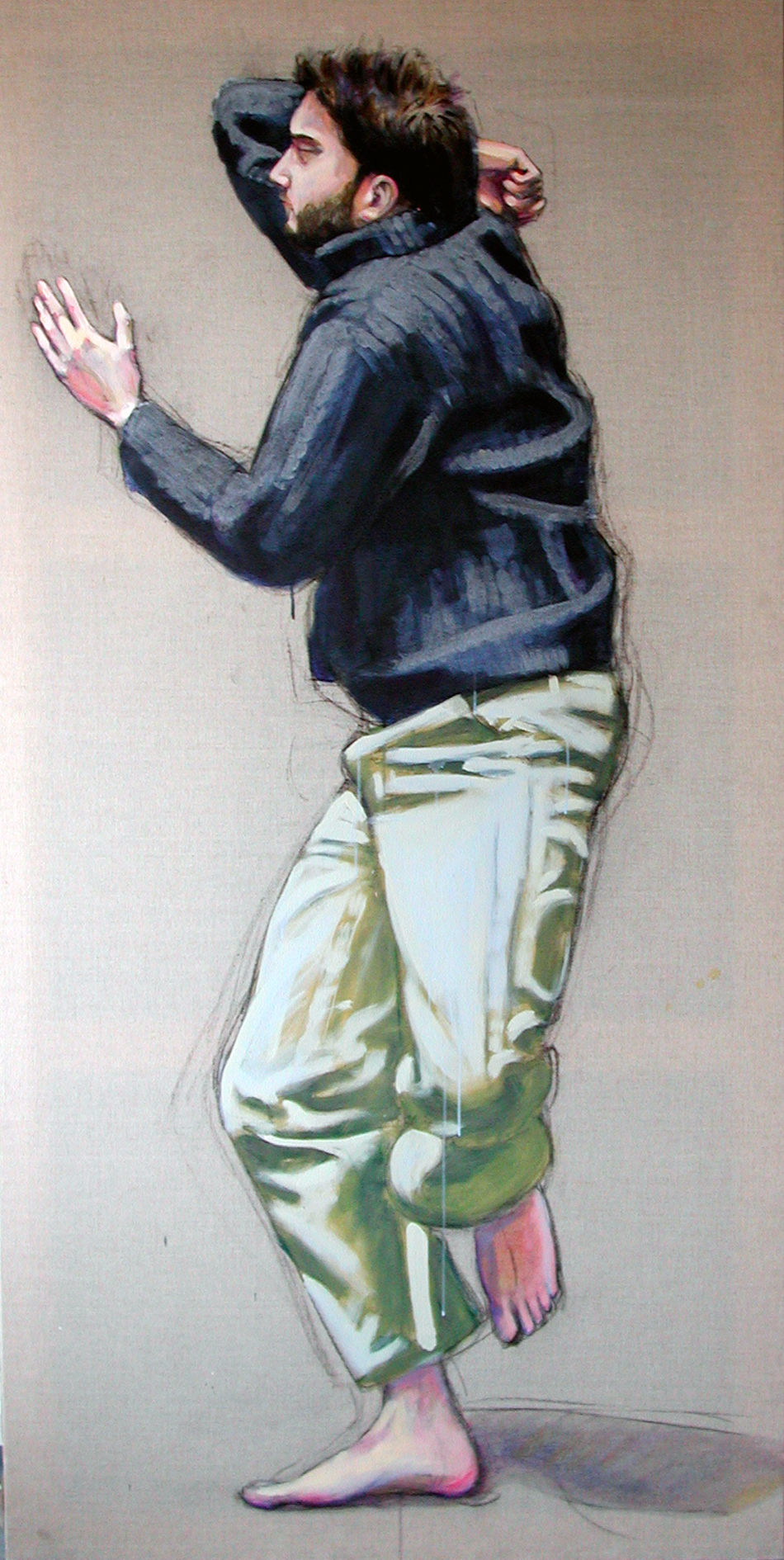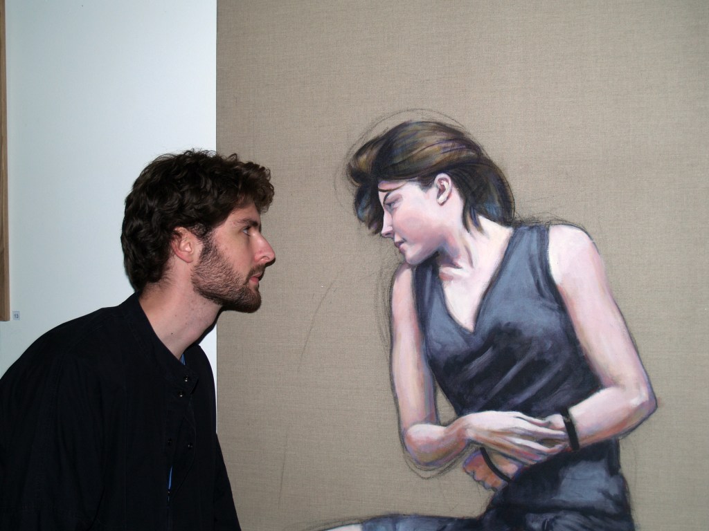 Une lumière qui éclaire chaque panneau de toute l’histoire de la peinture, une fresque qui sourd d’un fond de matière brute comme un clin d’œil au passé, un scalpel de lumière qui déchire les arêtes des visages avec la même cruauté qu’un Caravage, les plissés antiques revisités en blue-jean…, une réappropriation de la figuration d’hier, d’aujourd’hui, et sans doute de demain. Ce jeune homme est à l’âge de toutes les exigences. Il ne s’épargne pas. Son pinceau comme un couperet dans le vif du sujet. L’intransigeance même.