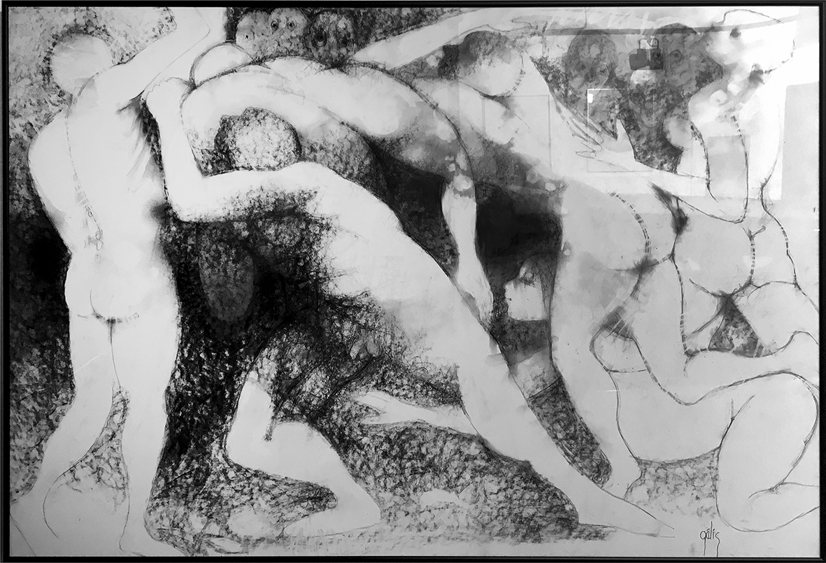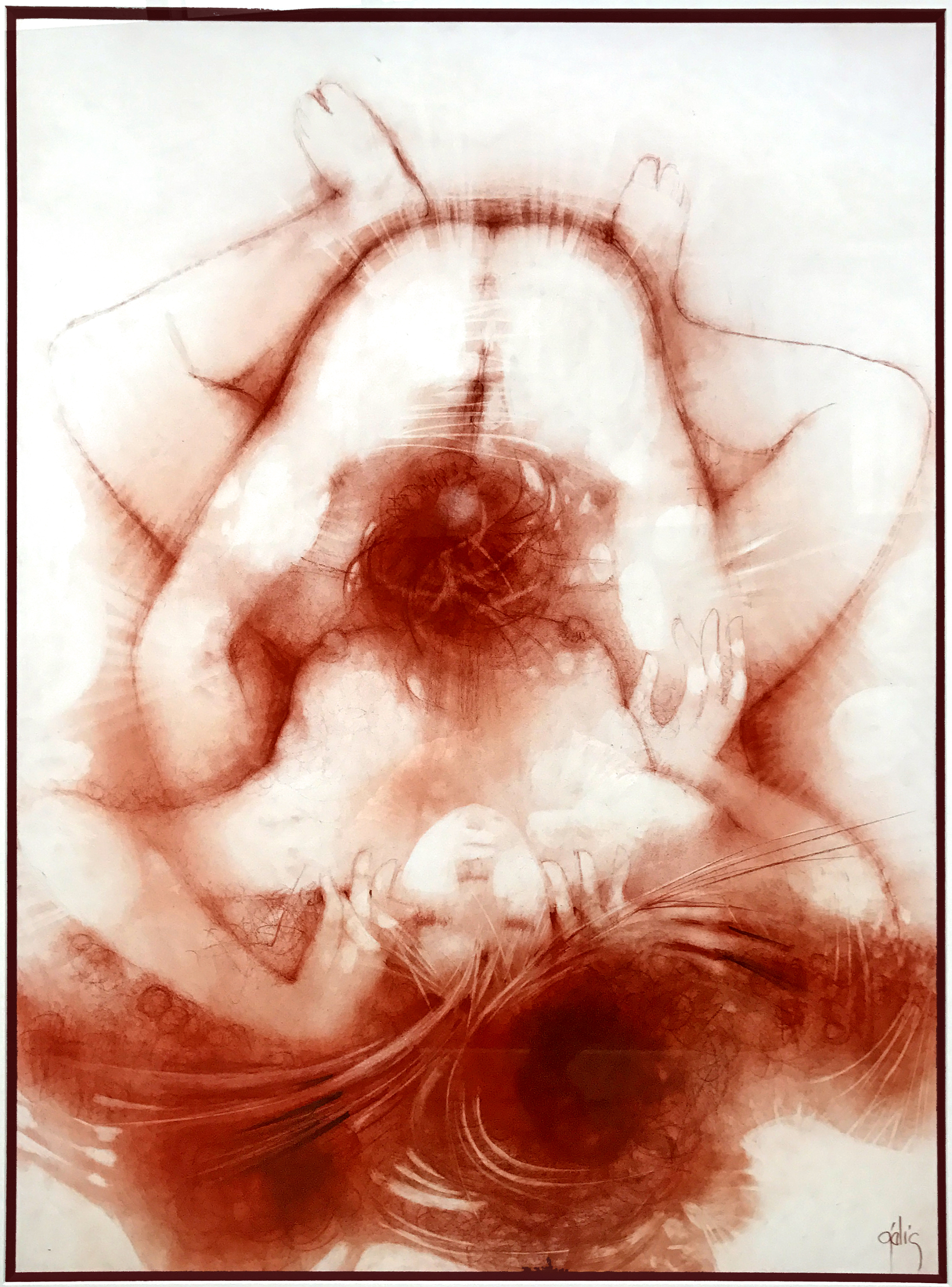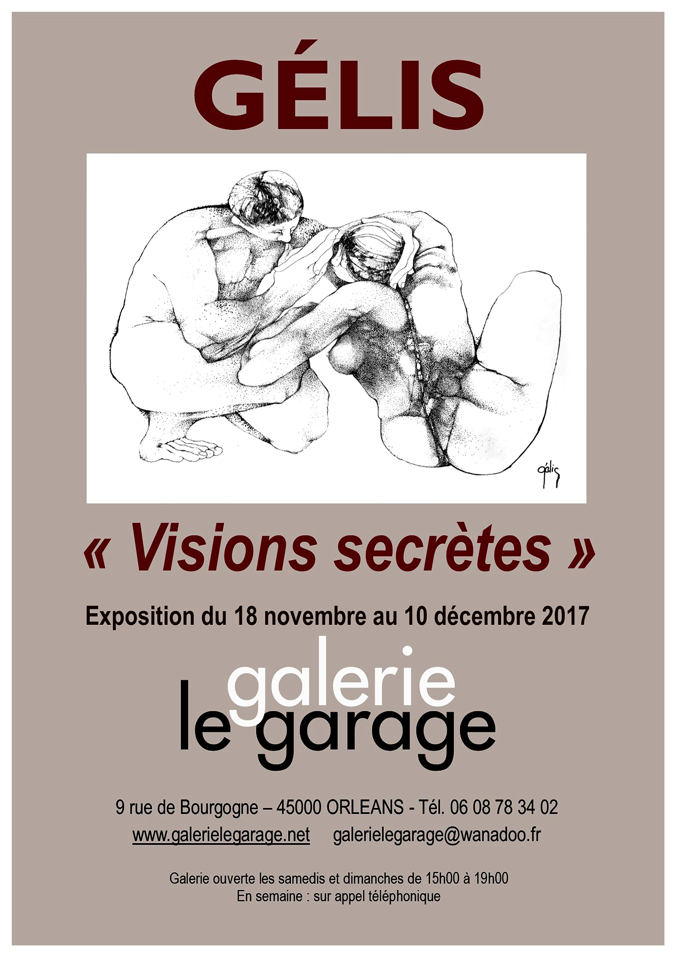 En 2017, peu avant Noël, comme un cadeau, c’est à la galerie Le Garage, que le peintre se révèle un dessinateur sorcier avec, notamment, de fameux dessins à la plume, technique présentée il y a cinquante ans en Allemagne et en Hollande mais jamais en France. Cette fois, Gélis y privilégie le vif au moelleux. Quelques mots à propos de ces œuvres de grand format à la Breughel, parfois péchés capitaux et capiteux, méconnus et saisissants, secrètement couvées à l’abri de ses toiles solaires : « Ce sont des crobars que je fais depuis des années et c’est le moment de les montrer. C’est presque du surréalisme, le contrepoint de l’air et de l’eau qui sont mes thèmes de prédilection. J’y joue beaucoup sur les regards. » Et Gélis d’expliquer comment il crée ces œuvres méconnues et saisissantes : « Je mets un mois pour un dessin. Je prends le temps. Je ne veux pas trop le fatiguer. Pour moi, ce sont des dessins de sculpteur. »