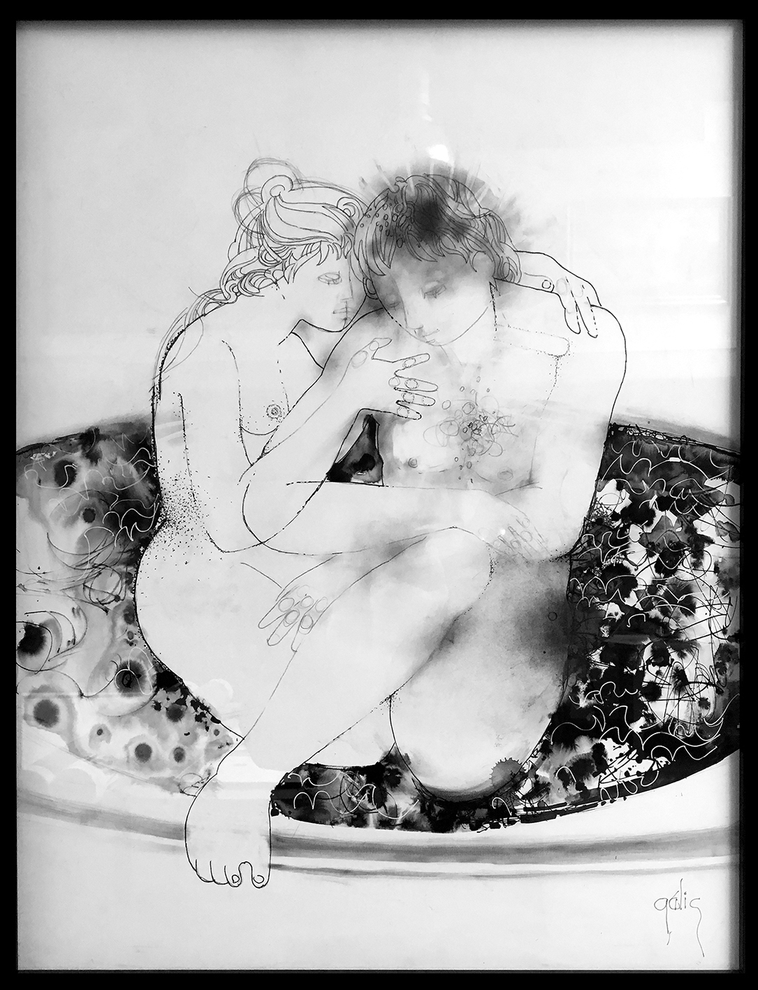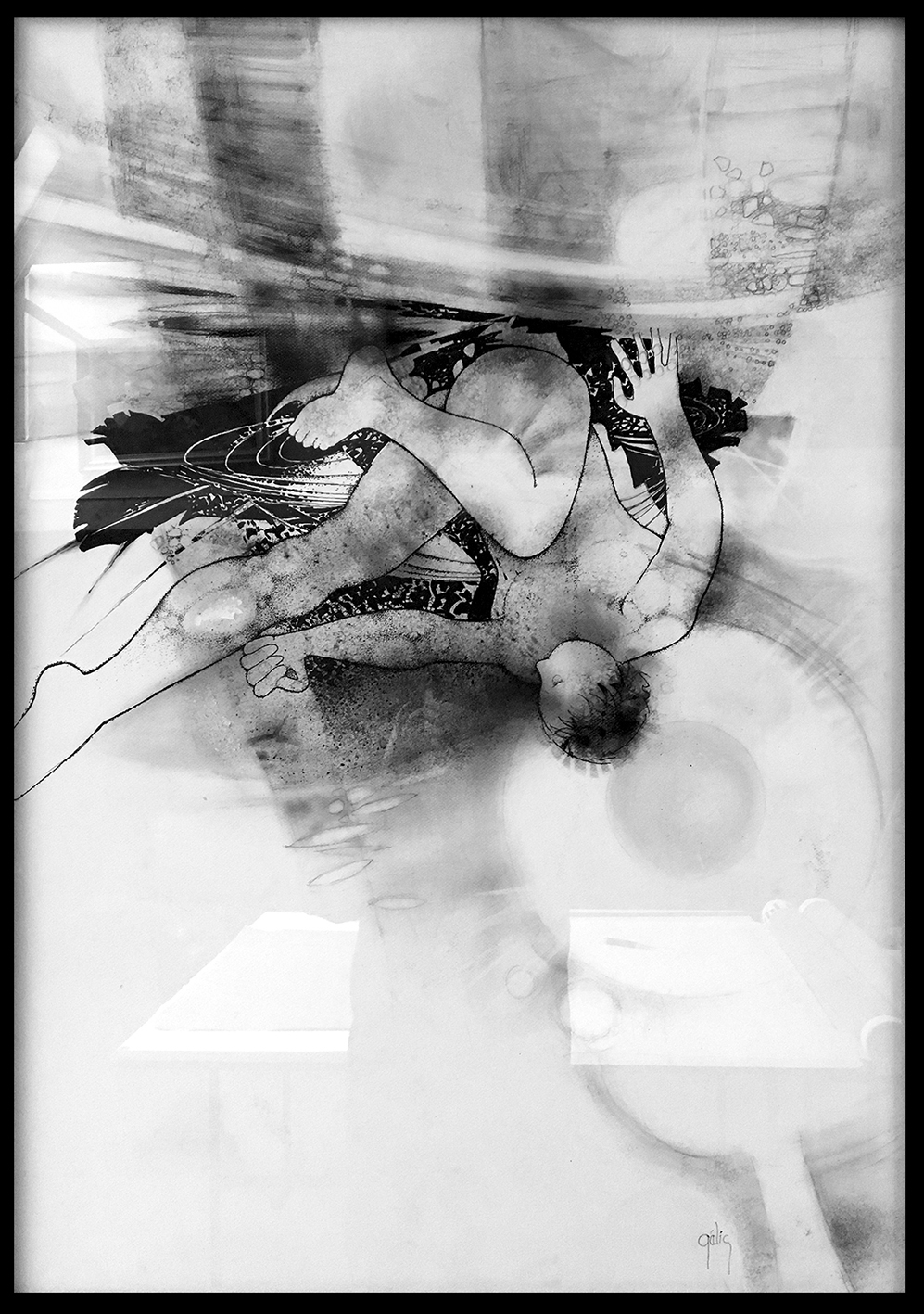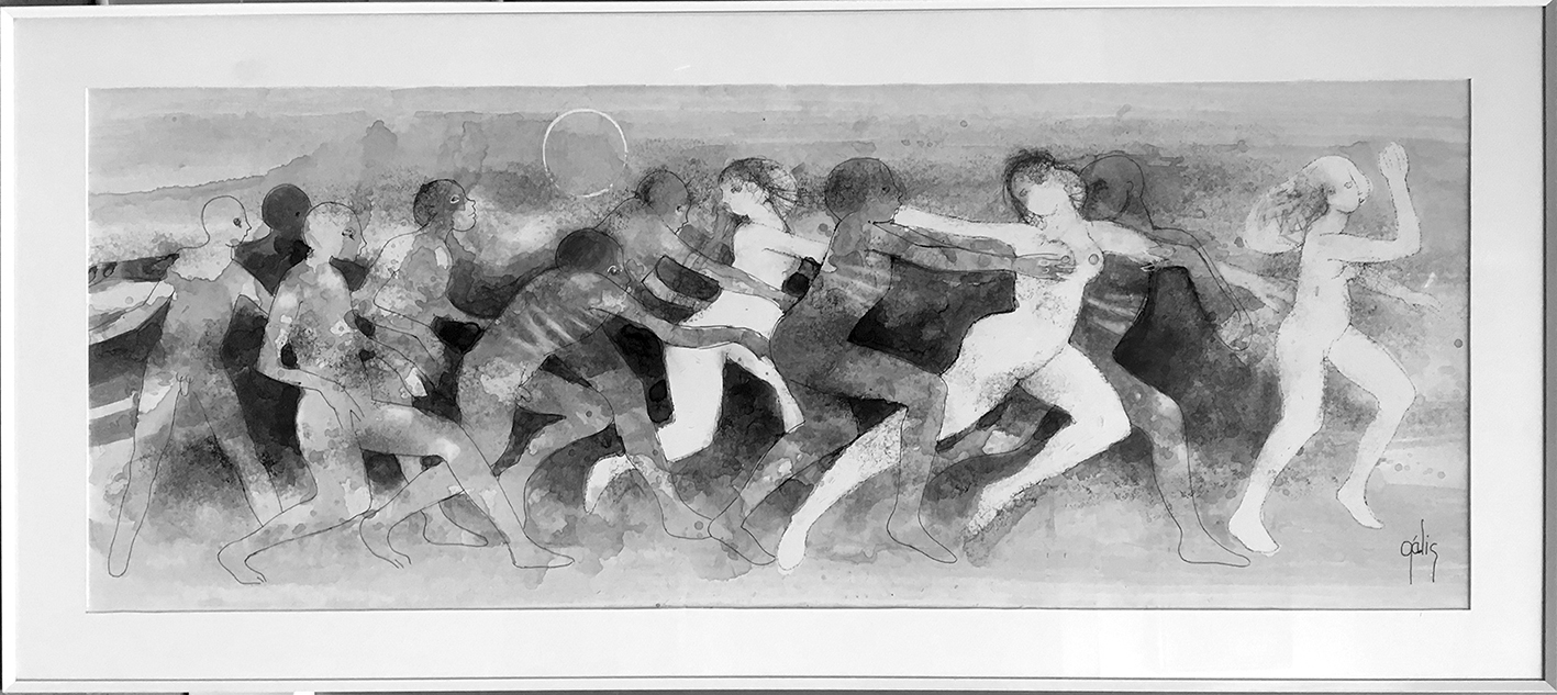 En 2017, peu avant Noël, comme un cadeau, c’est à la galerie Le Garage, que le peintre se révèle un dessinateur sorcier avec, notamment, de fameux dessins à la plume, technique présentée il y a cinquante ans en Allemagne et en Hollande mais jamais en France. Cette fois, Gélis y privilégie le vif au moelleux. Quelques mots à propos de ces œuvres de grand format à la Breughel, parfois péchés capitaux et capiteux, méconnus et saisissants, secrètement couvées à l’abri de ses toiles solaires : « Ce sont des crobars que je fais depuis des années et c’est le moment de les montrer. C’est presque du surréalisme, le contrepoint de l’air et de l’eau qui sont mes thèmes de prédilection. J’y joue beaucoup sur les regards. » Et Gélis d’expliquer comment il crée ces œuvres méconnues et saisissantes : « Je mets un mois pour un dessin. Je prends le temps. Je ne veux pas trop le fatiguer. Pour moi, ce sont des dessins de sculpteur. »