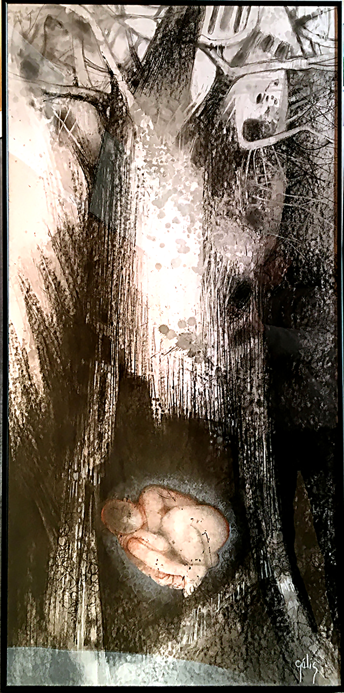 Mis à part deux trois grandes toiles, Gélis privilégie exclusivement des œuvres sur papier célébrant encre de Chine à la plume, lavis, collage, fusain, mine de plomb, crayon graphite, sanguine. Ici, pas de thème à proprement parler. Seule une thématique, une unité d’ensemble qui joue sur l’ombre et la lumière. Plus que des repentirs, des déchirures d’œuvres ont précédé ce rendez-vous où l’artiste privilégie « le rapport entre le trait et le blanc ». Ce blanc qui n’est autre que « le silence du papier. »