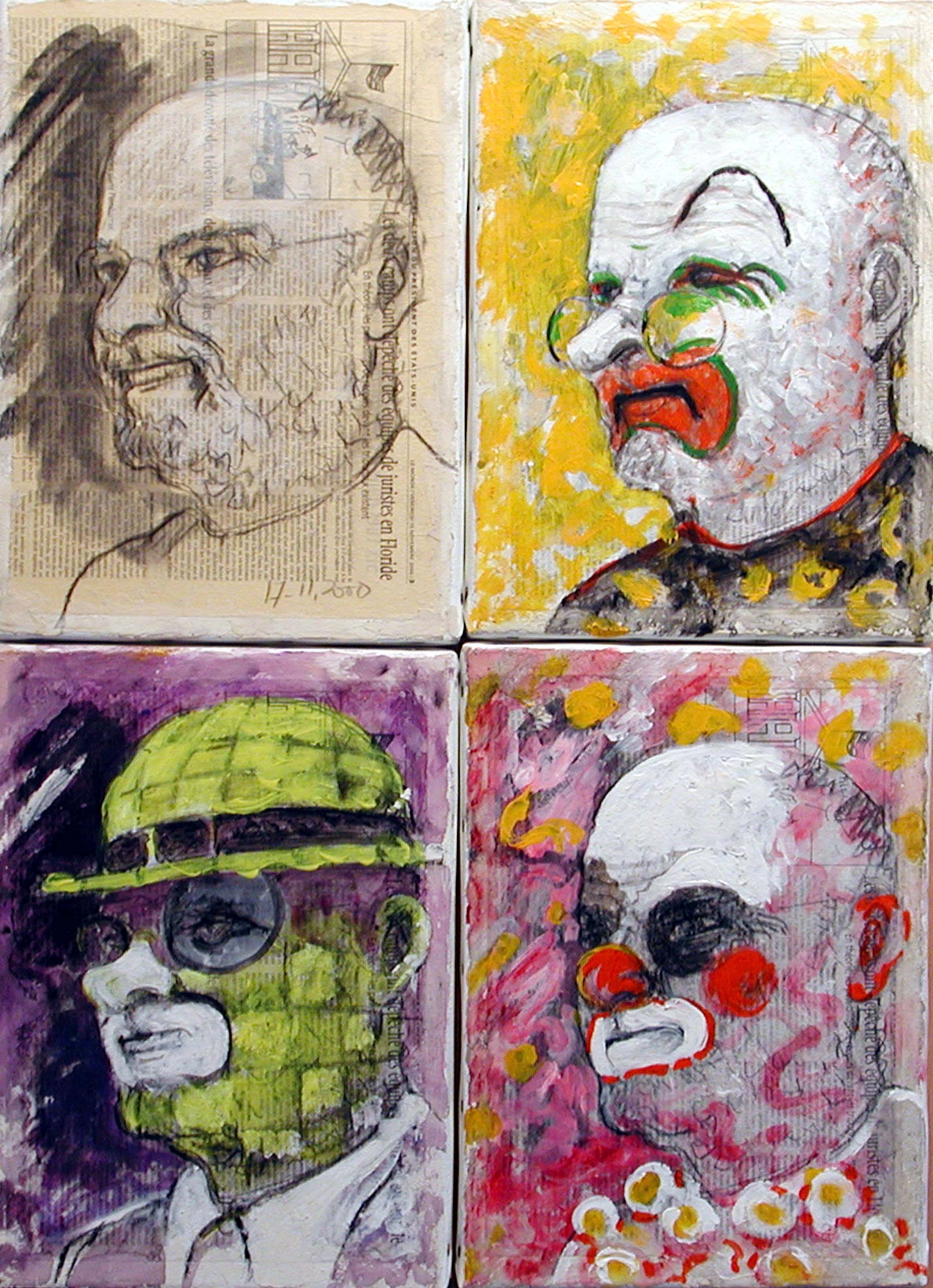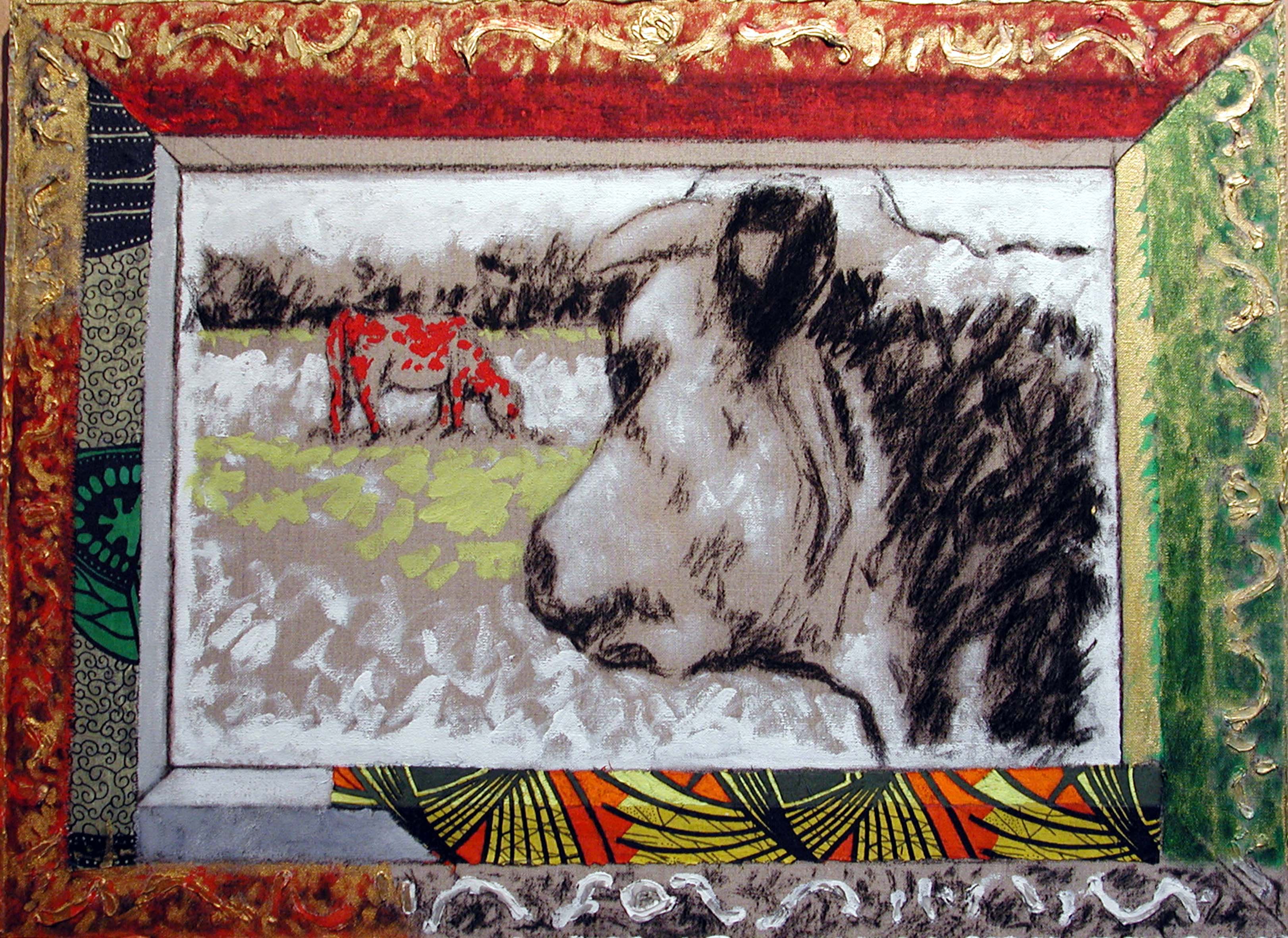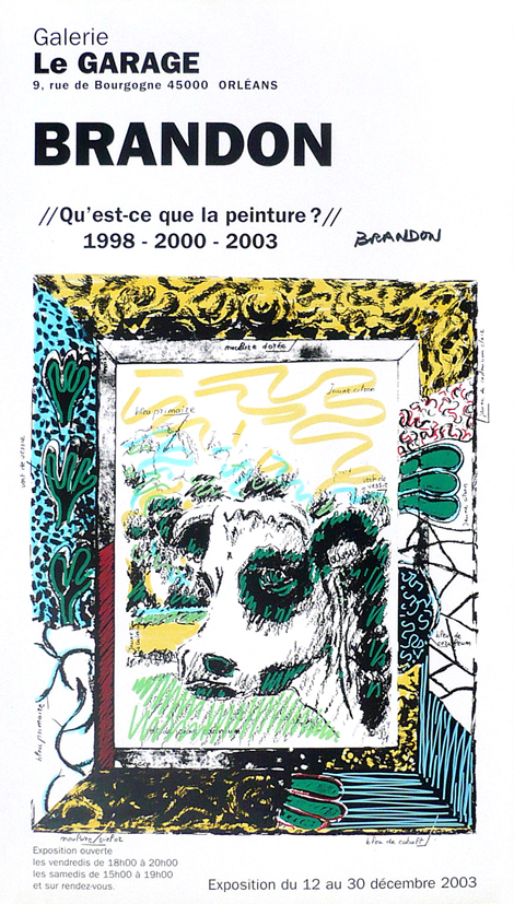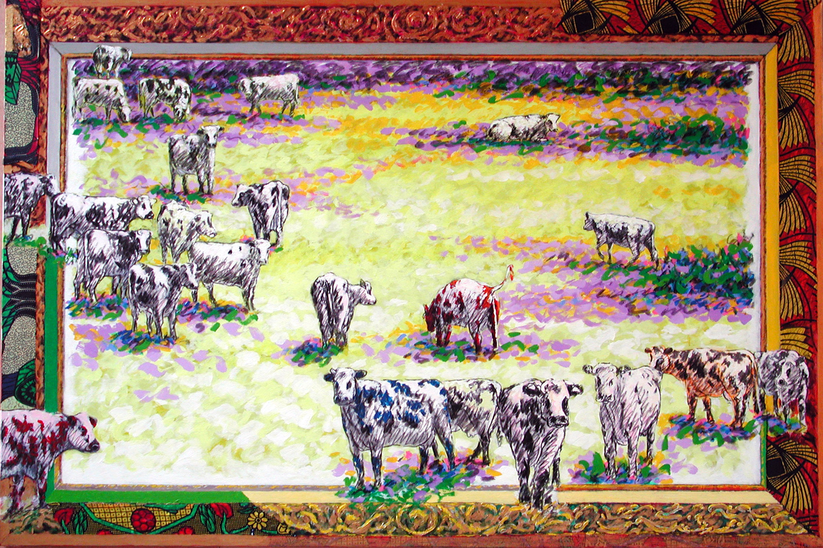 Après différentes séries comme « ça ira bien avec les doubles rideaux », « Les Vanités », « la liseuse », « Moi, Moi, Toujours Moi », et bien d’autres, je m’enfonce de plus en plus dans la problématique de la peinture, mais qu’est-ce que la peinture ? L’instinct, le plaisir, la fuite, un concept, le retour à l’enfance, la mémoire ? ; c’est pour moi raconter les plaisirs, les peurs, les espoirs, les désirs, avec des moyens simples : une surface et de la couleur, en sachant la place que prend un « tableau » dans le cadre de notre société. Dans cette série, de nouveau, je veux transmettre la vie, la joie de peindre, et quel que soit le sujet, des vaches en l’occurrence, l’essentiel est d’aller au bout de ses possibilités, jusqu’à la non maîtrise : installation d’un cadre, en fallait-il un, oui ! mais qu’en faire ? : pour moi obligatoirement un travail pictural, indépendant de l’œuvre encadrée, une nouvelle possibilité de rebondissements, d’interrogations permanentes.