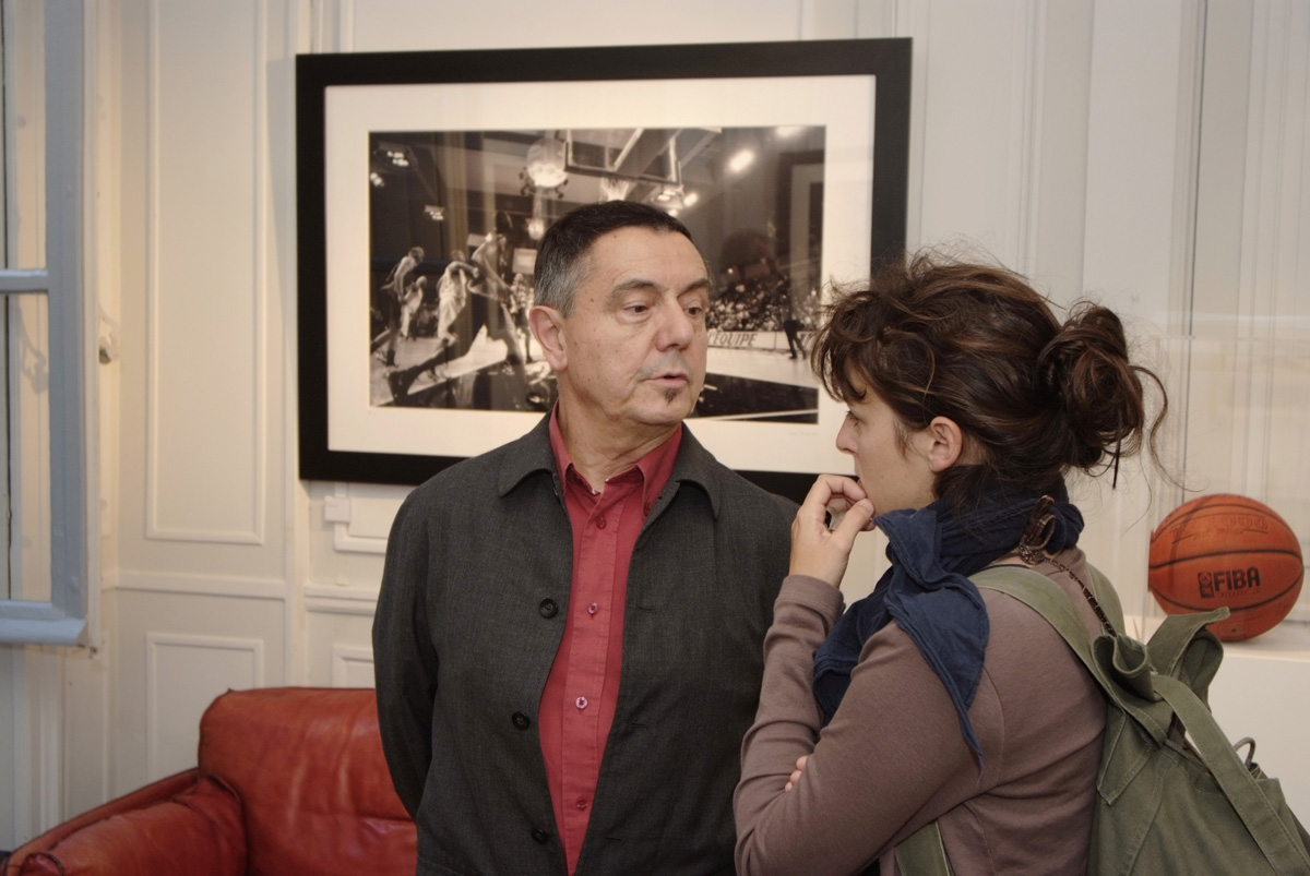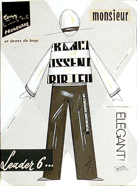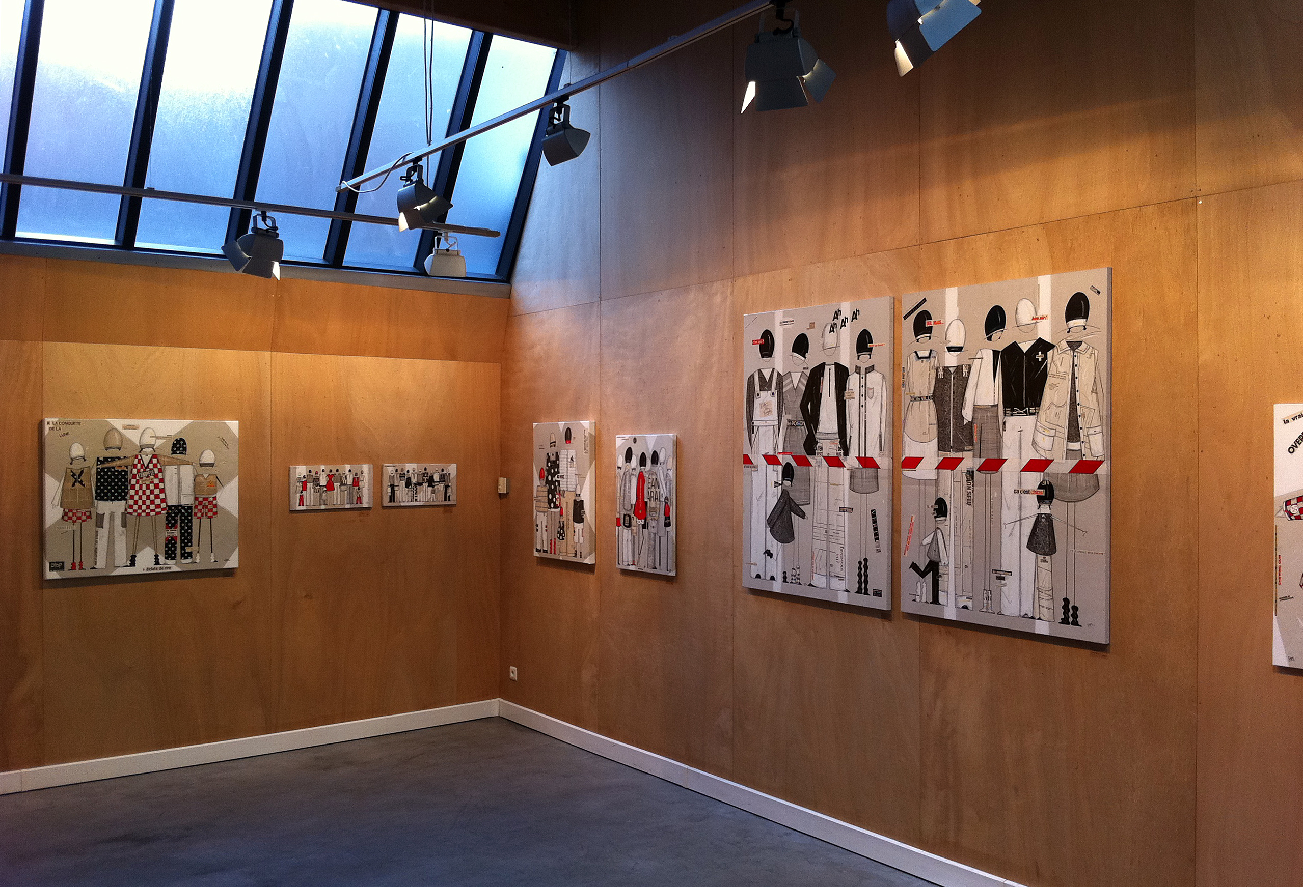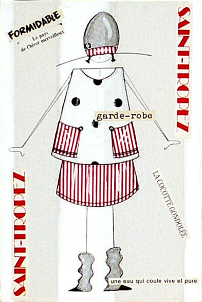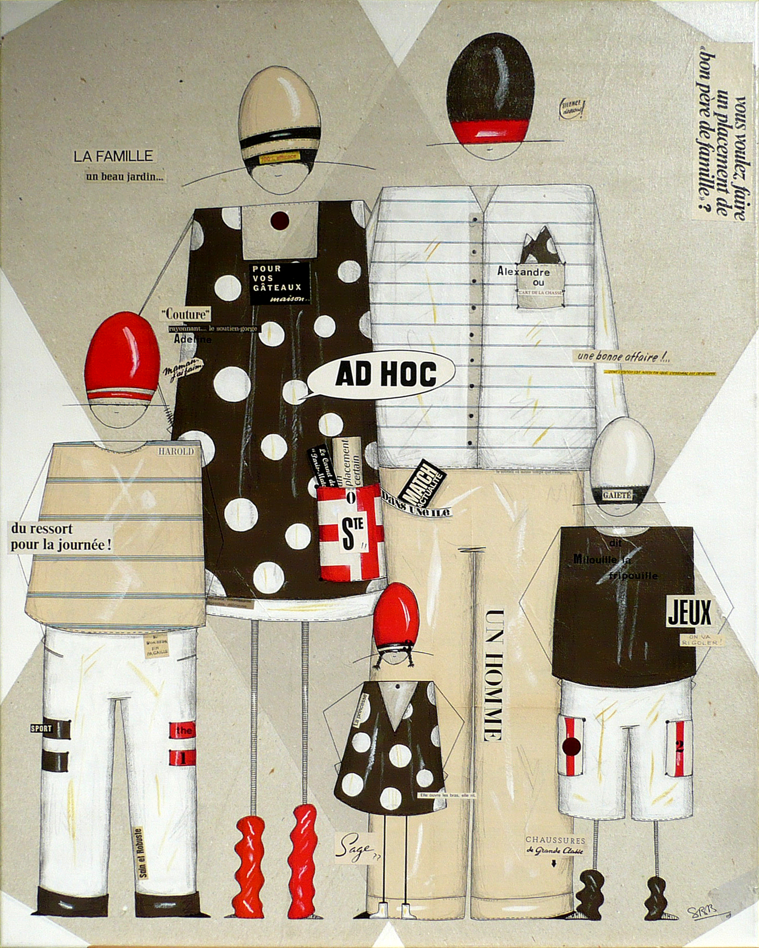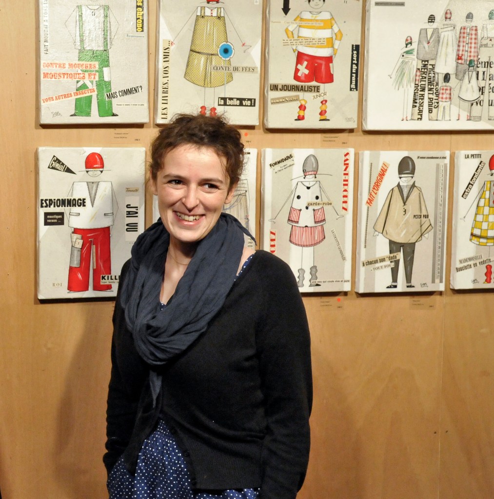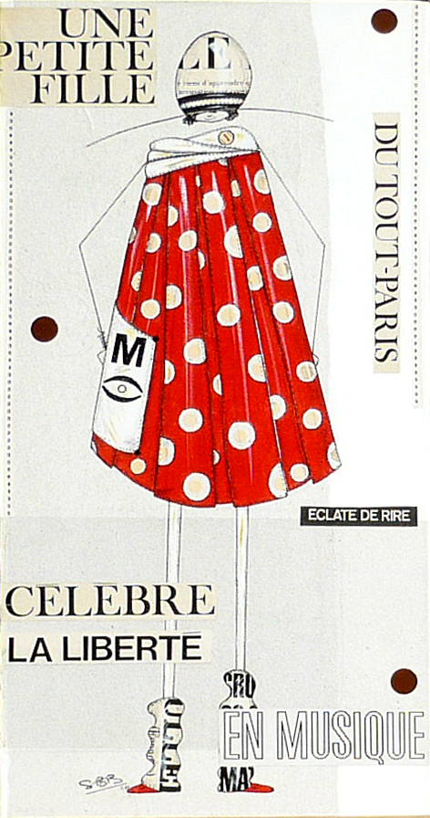 Par un coup de crayon qui tient de la griffe par sa précision, Sophie Beguin Billecocq nous transporte dans un univers ludique, frais, pétillant, dans lequel chacun peut entrer. Comme dans une récréation enfantine où le sérieux d’une formule distribue le rôle: » on dirait que tu es… « , chacun peut participer, insouciant, aux jeux et à la ronde pleine de promesses de la ribambelle. Ribambelle qu’il nous plaît d’imaginer vivante et impertinente… Le noir, le blanc, le rouge, le gris seraient austères si petits pois ou rayures ne faisaient danser ces silhouettes légères, graciles, souples. Familières par une très lointaine parentèle avec les illustrés de Bécassine, Tintin, Quick et Fluke… Les articulations et les membres sont à peine notés, aucune arabesque ne relie les garçons et les filles les uns aux autres, seul l’air du temps par le vestiaire qui les différencie, accomplit cet office. Sans yeux, sans bouche, sans expressions, les personnages deviennent alors aussi doucement inquiétants qu’un mannequin abandonné dans la réserve en sous-sol d’un grand magasin. Le jeu est alors plus sérieux qu’on ne l’aurait cru.