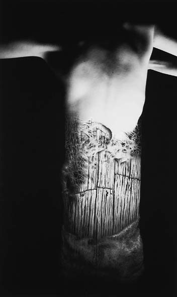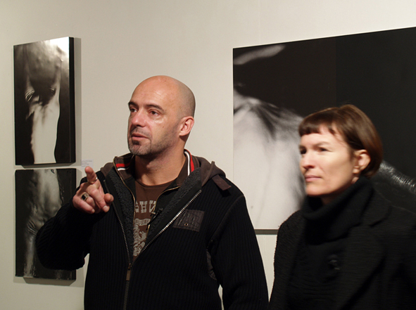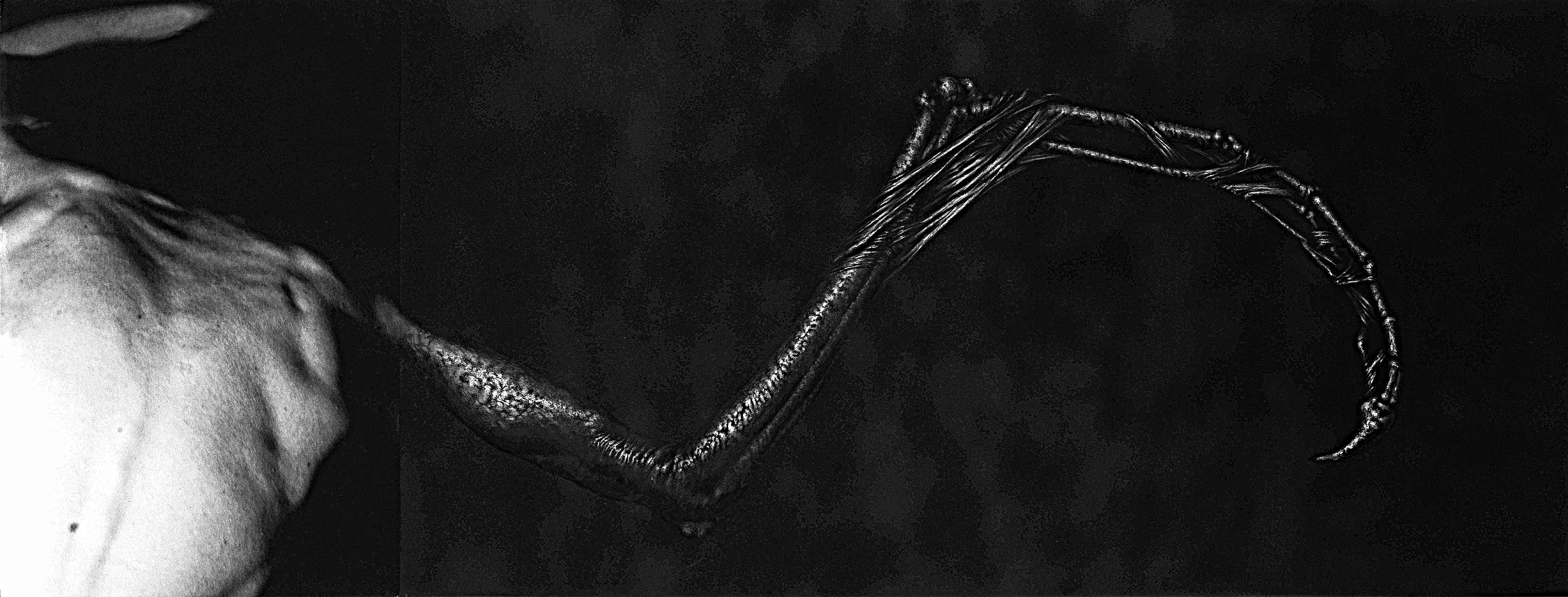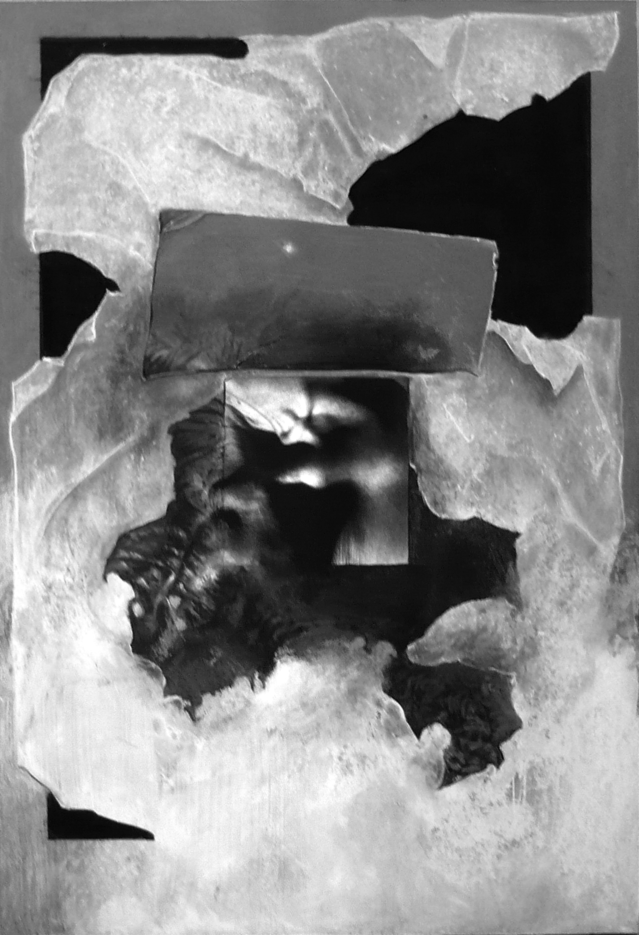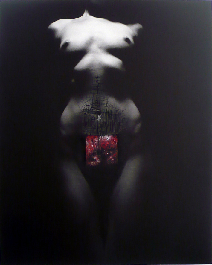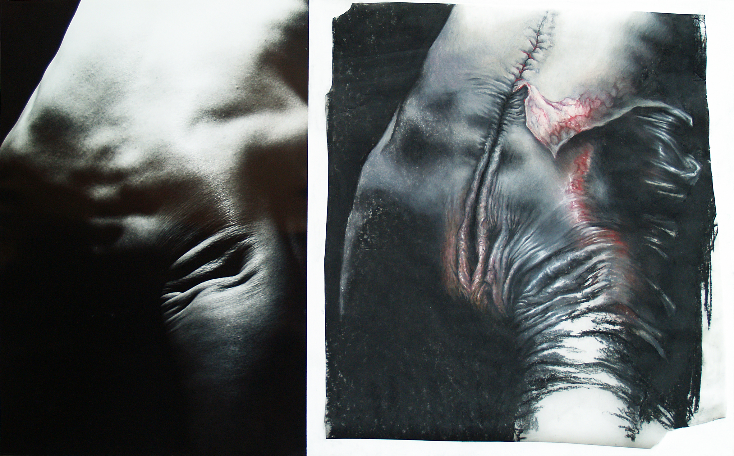 C’est en effet par le biais de la chair, en fusionnant la photographie et le dessin (acryliques/pastels secs) avec la même prédilection pour le traitement noir/blanc, que la mutation s’est opérée.