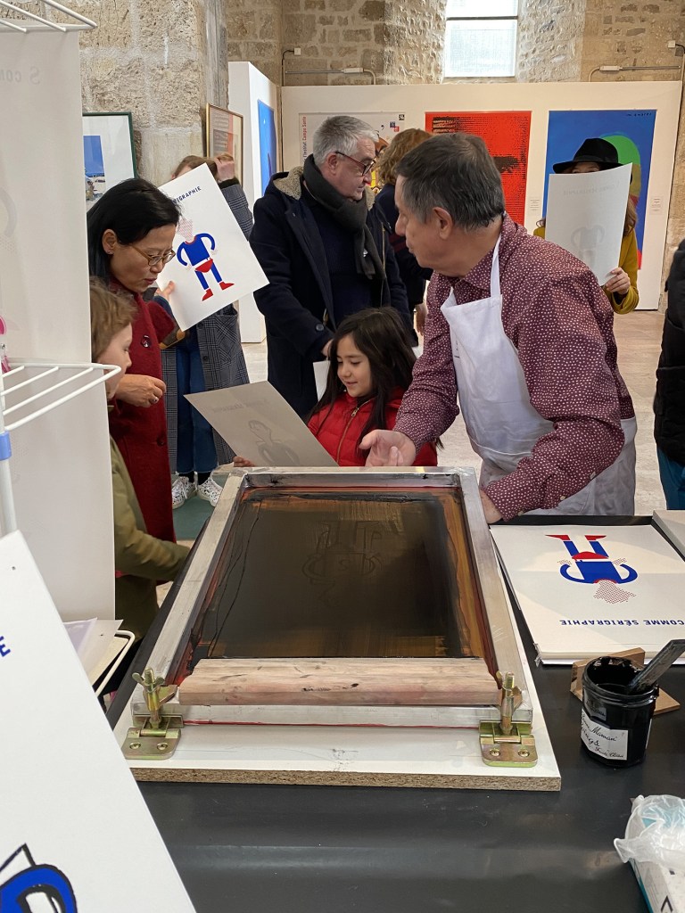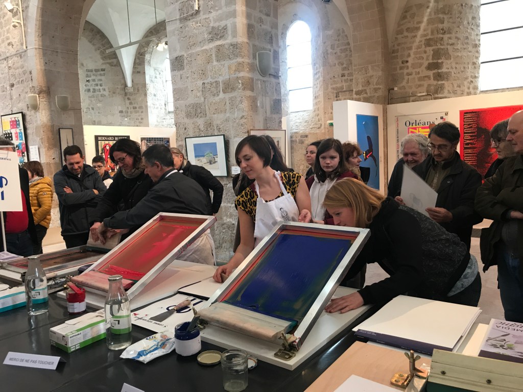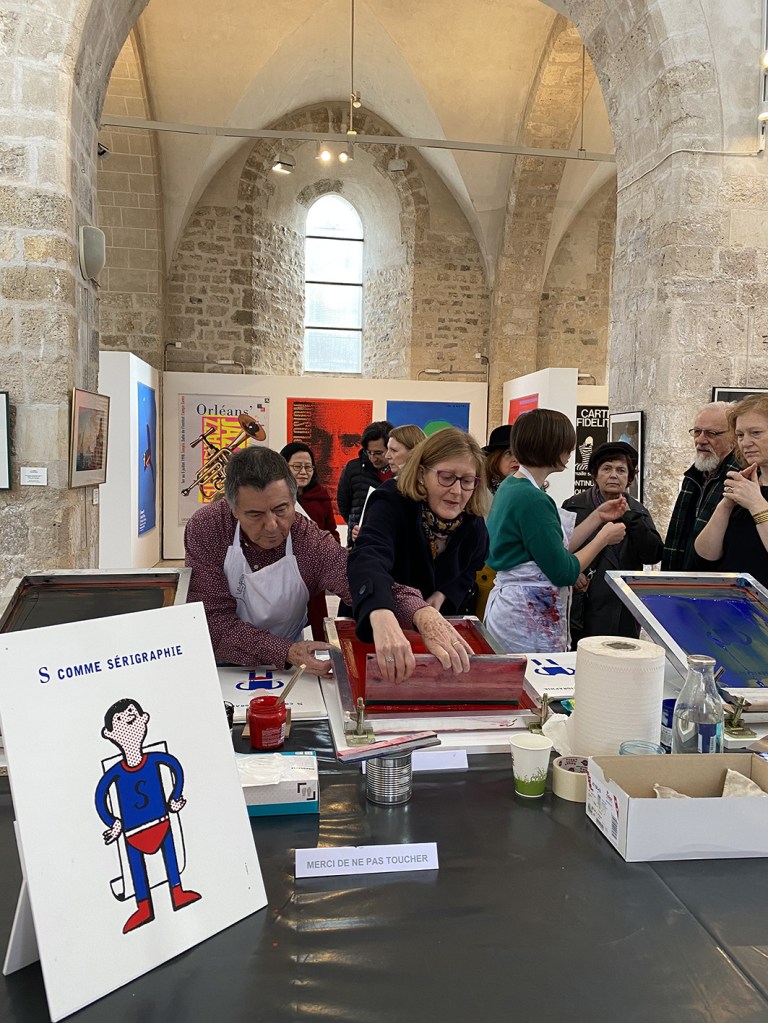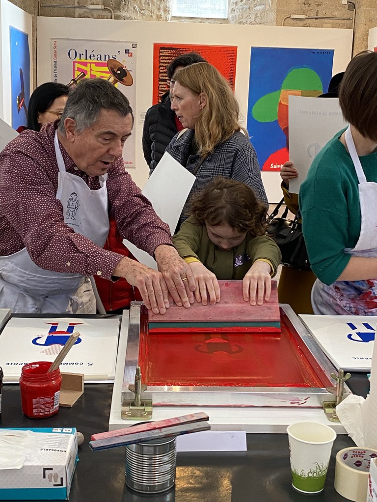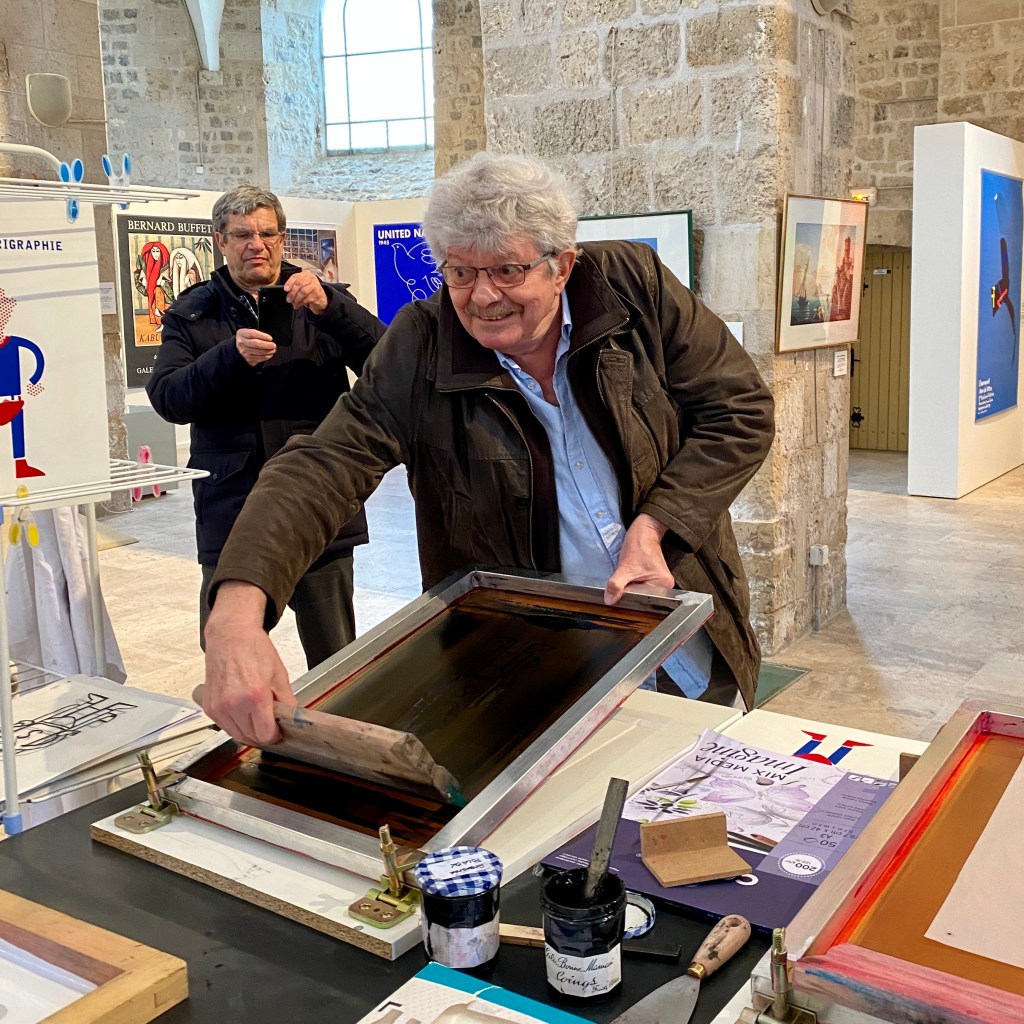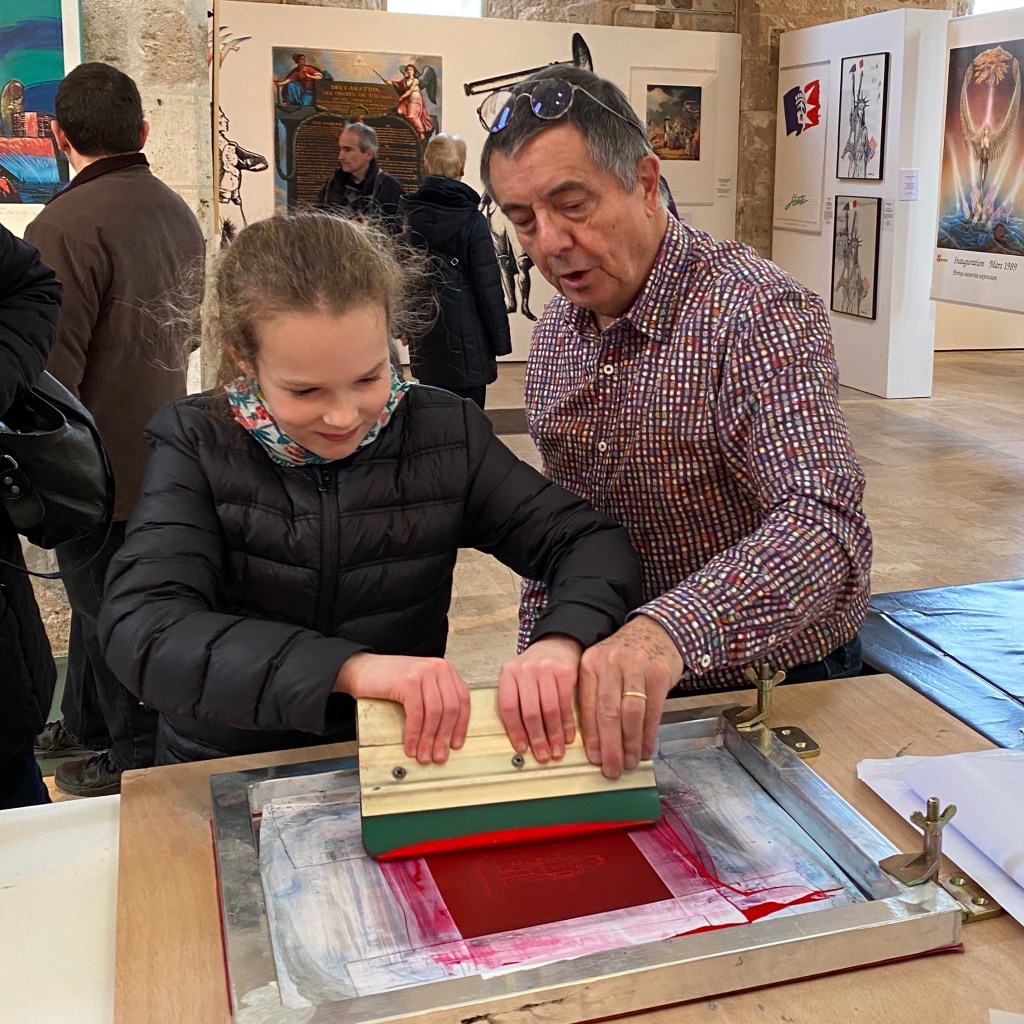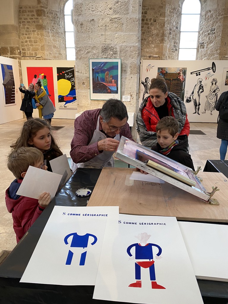 Durant l’exposition de nombreux visiteurs de tous âges ont pu s’initier à la sérigraphie en imprimant en trois couleurs le petit personnage de l’affiche créé par Vincent Burille.