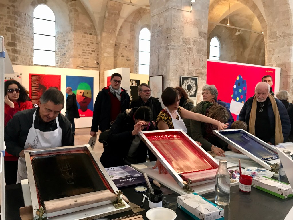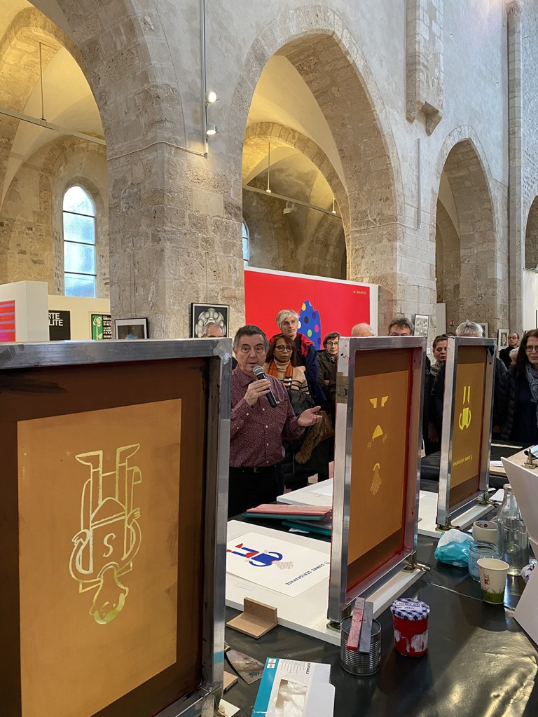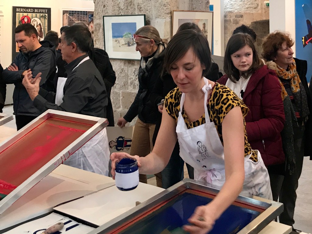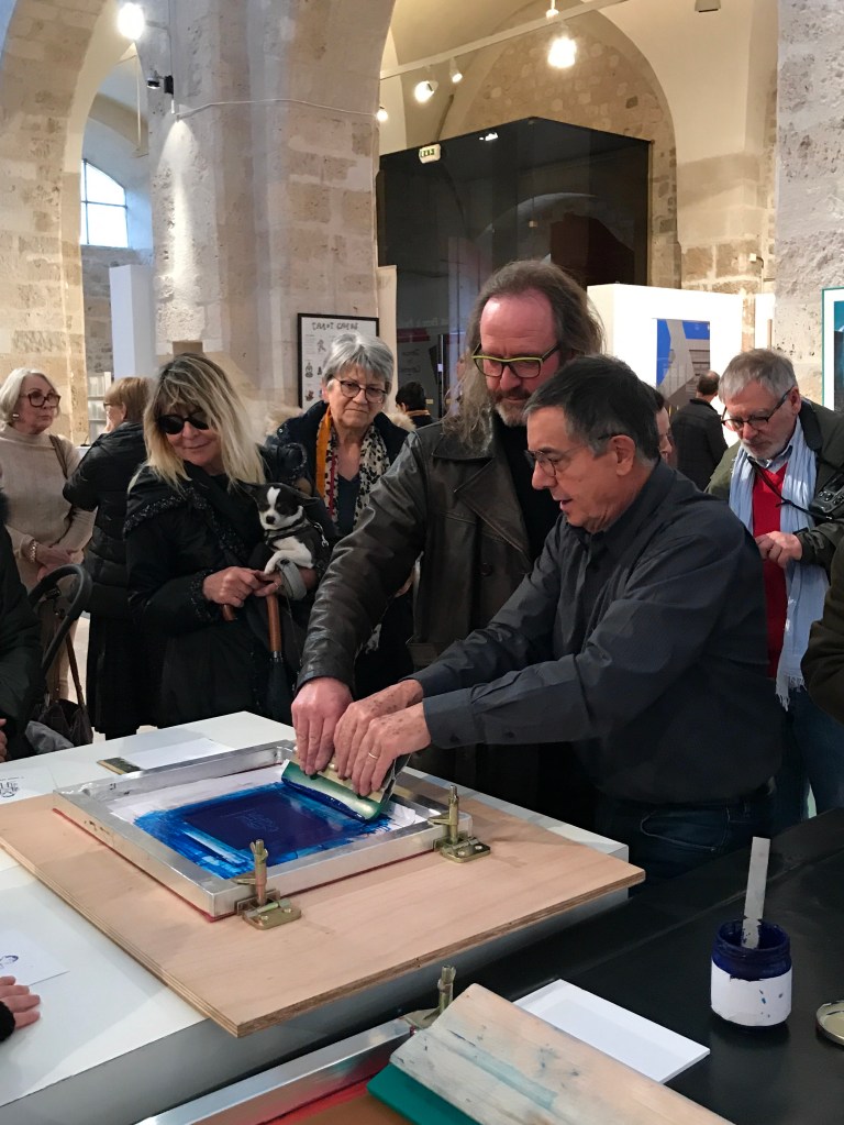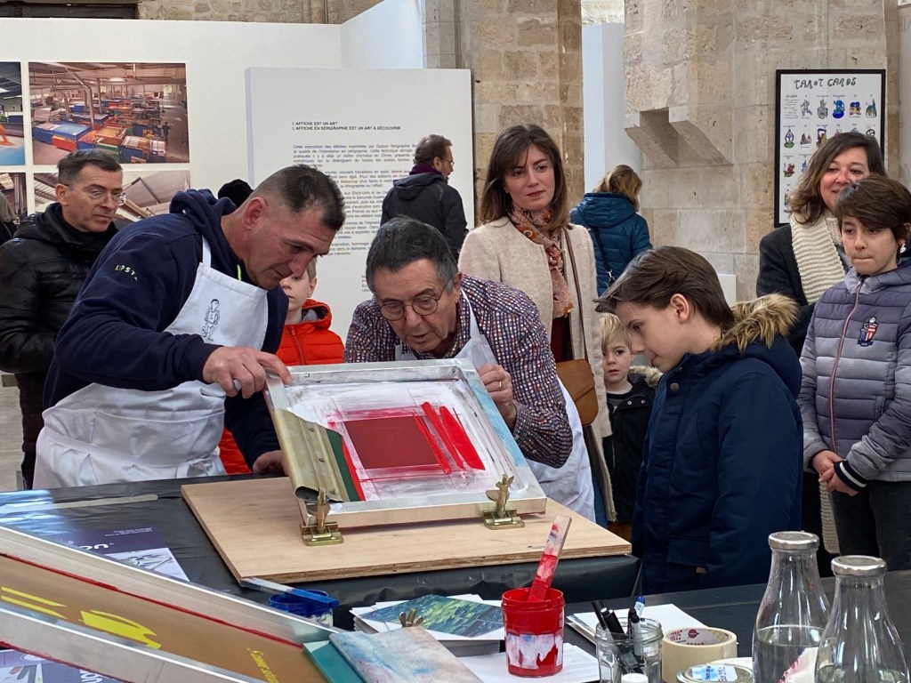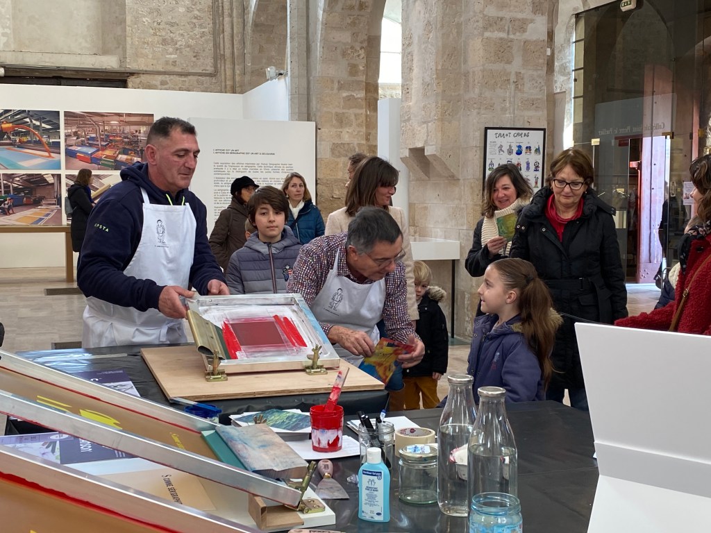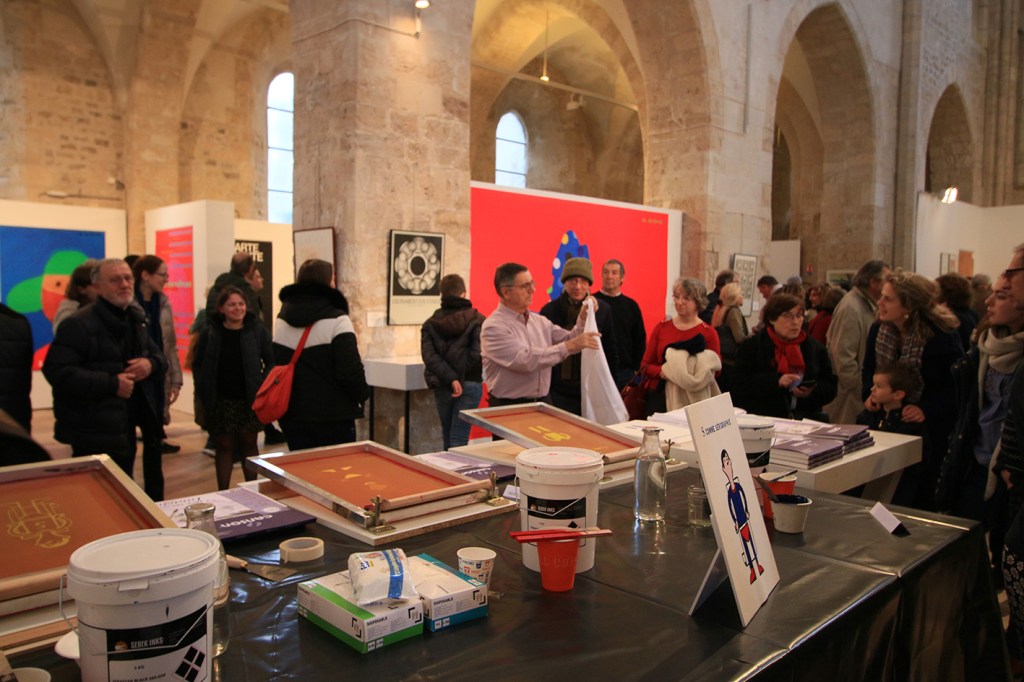 Durant l’exposition de nombreux visiteurs de tous âges ont pu s’initier à la sérigraphie en imprimant en trois couleurs le petit personnage de l’affiche créé par Vincent Burille.