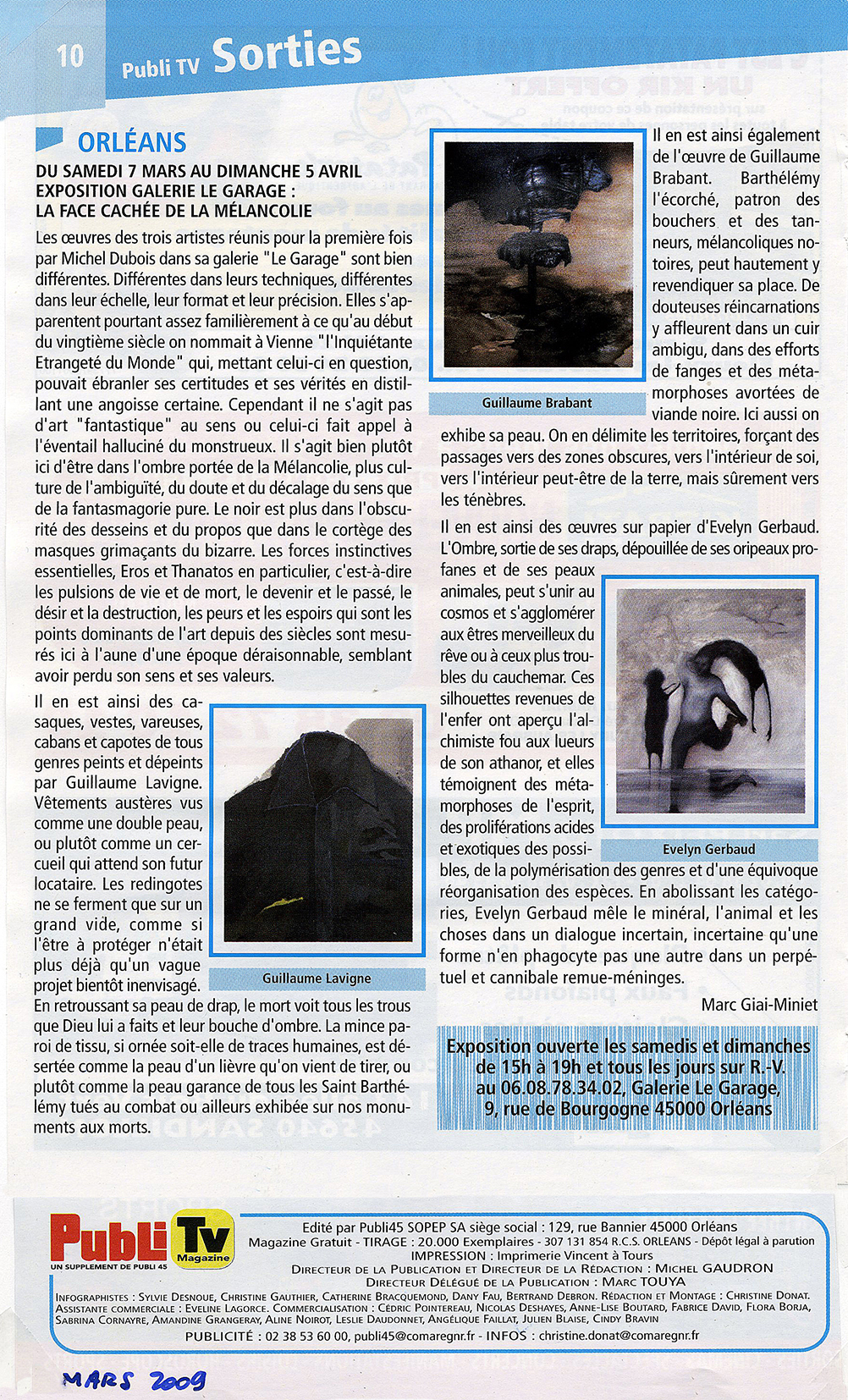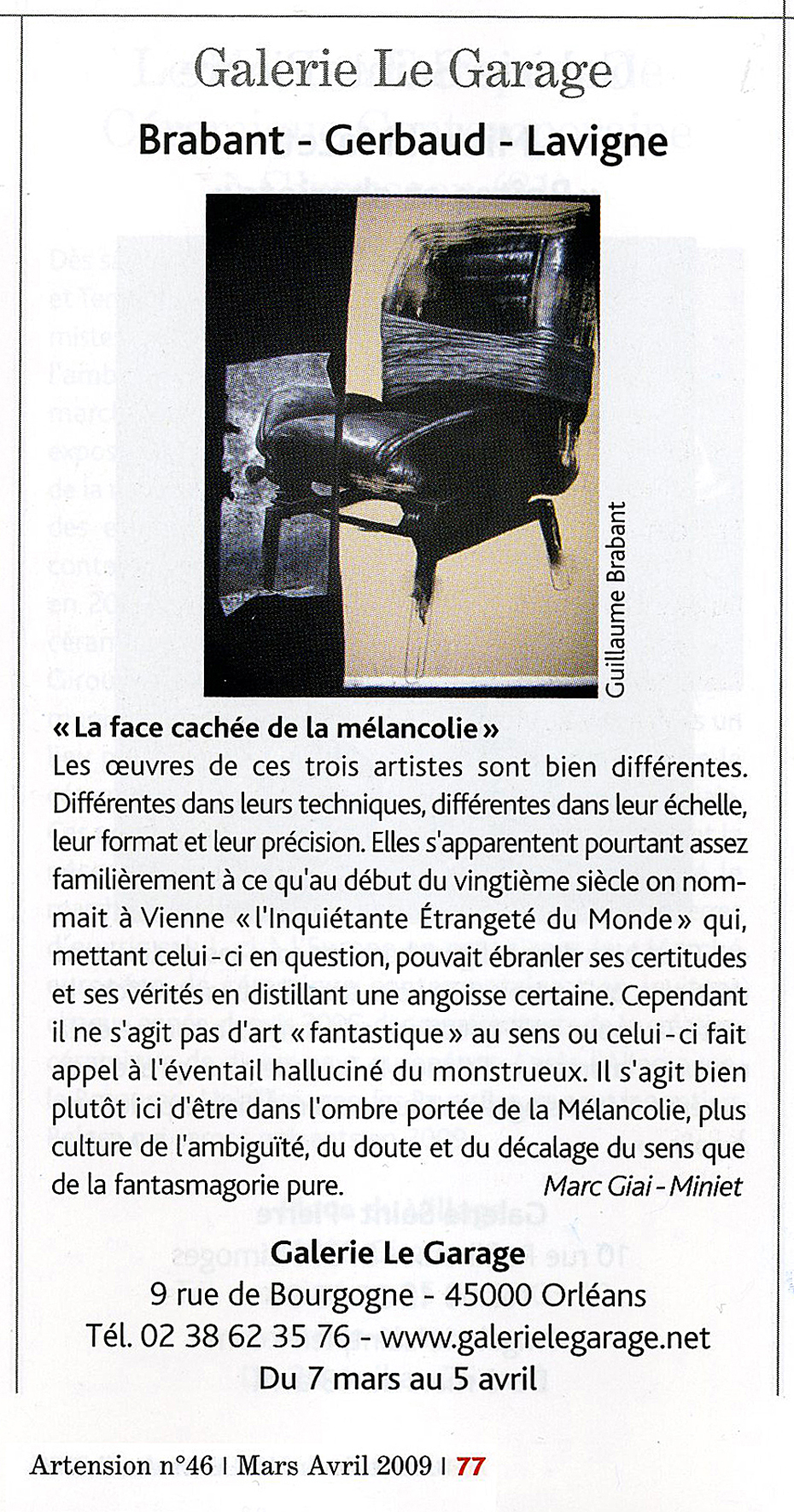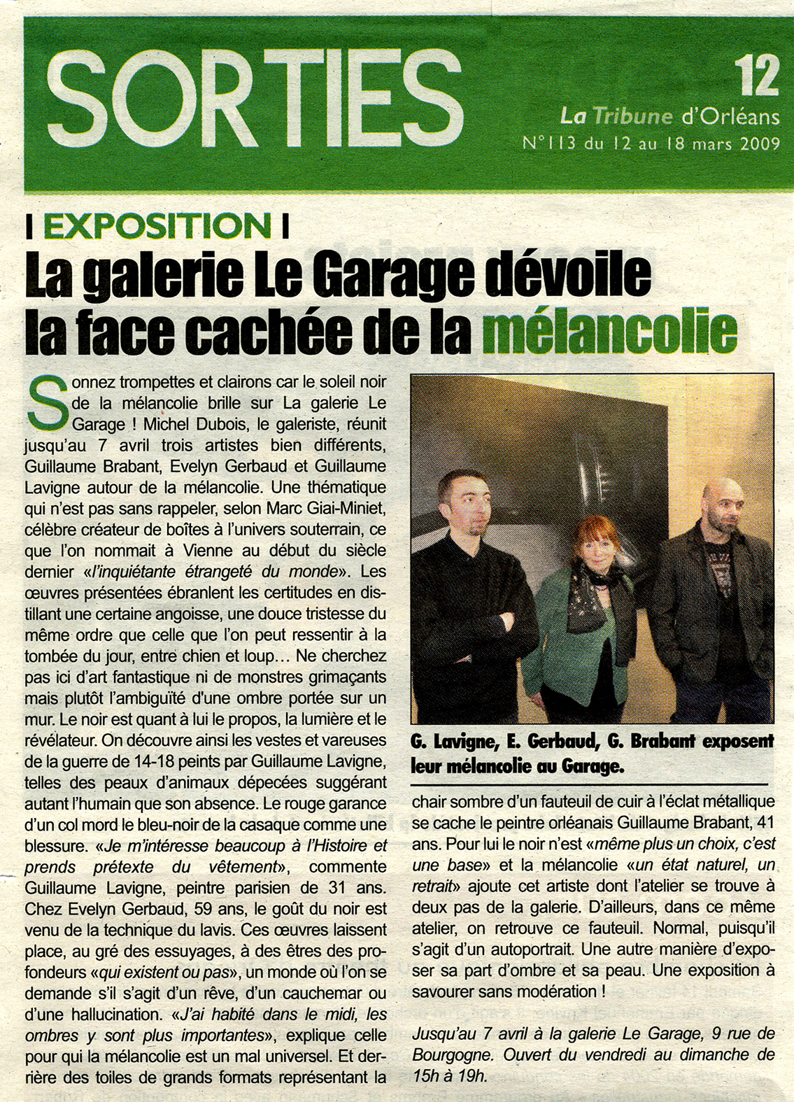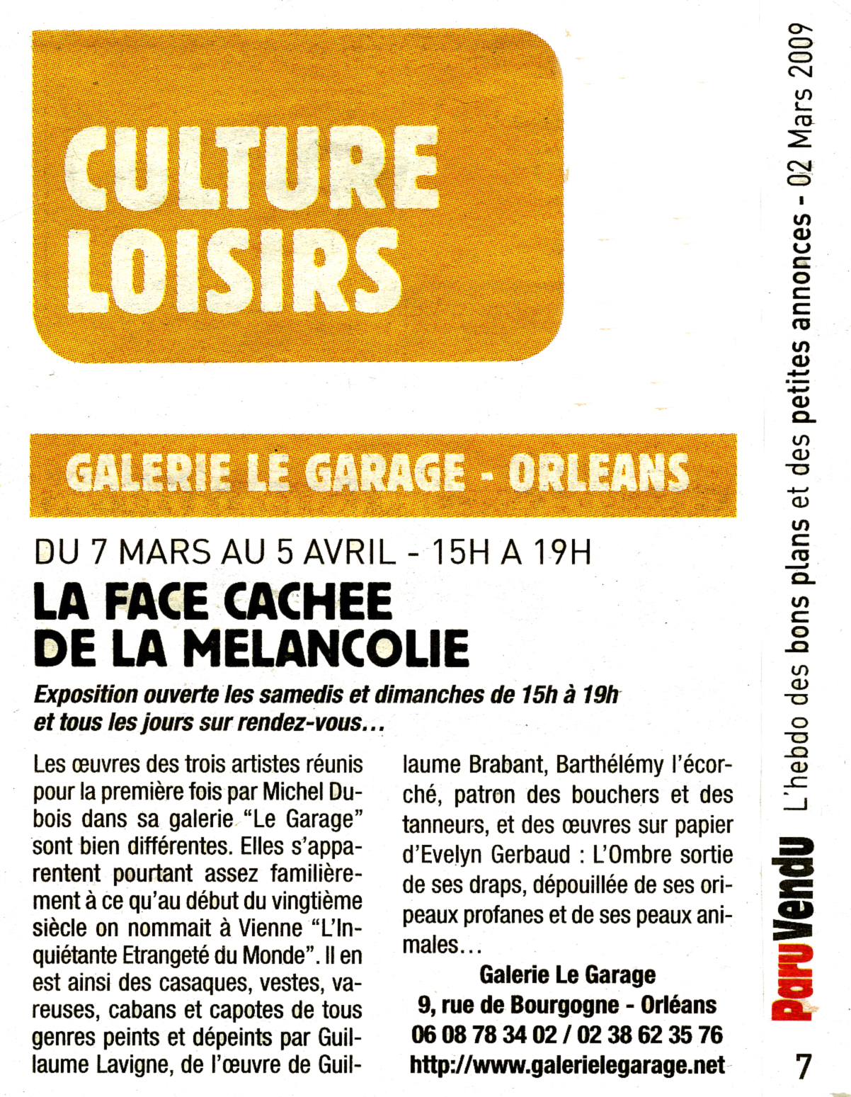 Le 11 décembre 2003, un lieu d’exposition ouvrit ses portes, rue de Bourgogne à Orléans. Sans vitrines ni trompettes, Frédéric Brandon, premier artiste invité, posa symboliquement la question : “Qu’est-ce que la peinture ?”. Ainsi commença l’histoire du “Garage”, galerie d’art contemporain que venait d’imaginer Michel Dubois. Actuellement fermé.